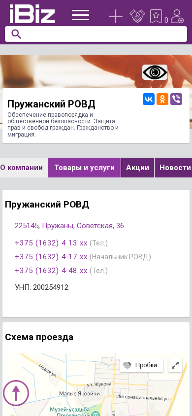 Название / ЗаголовокПружанский РОВД - Обеспечение правопорядка и общественной безопасности. Защита прав и свобод граждан. Гражданство и миграция.. 225145, Пружаны, , Советская, 36