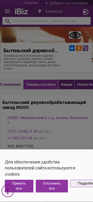 | AI-анализ | This online resource is dedicated to Bytensky Derevoobrabotyvayushchiy Zavod IOOO, a Belarusian woodworking factory specializing in the production of various furniture components and accessories. The company offers items such as wagon chairs, window sills, corners (both internal and external), batons, and floorboards for blockhouses, as well as accessories for saunas and baths. The website provides a map for visitors, contact information, and details on the company's location in the village of Bytень, Kosinskaya Street, number 2, in the Iwaczewiczy District of Belarus. The company's Unified State Register number is 800017952. The website is accessible from Monday to Friday, 9:00 AM to 6:00 PM, without lunch breaks |