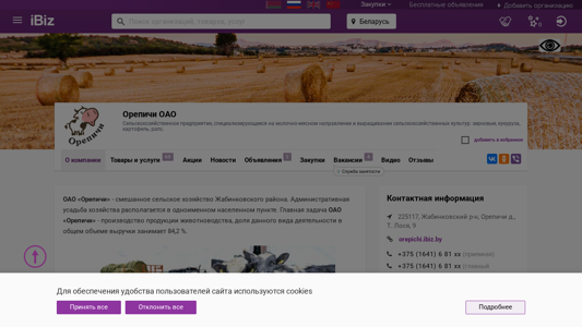 | AI-анализ | This online resource is a website for Orepichi OAO, a farming enterprise specializing in dairy and meat production, as well as cultivating various agricultural crops, including grains, corn, potatoes, and rapeseed. The administrative headquarters of the company is located in Orepichi village. The primary focus of Orepichi OAO is the production of agricultural products, with livestock accounting for 84.2% of its total revenue. The main activities of the enterprise include growing cereals and legumes, livestock farming, rapeseed cultivation, potato farming, feed production, construction, retail sales, veterinary services, transportation services, and more. Orepichi OAO cultivates winter wheat, winter barley, corn, oats, winter rapeseed, and potatoes. The enterprise's self-sufficient feed base, highly skilled workforce, |