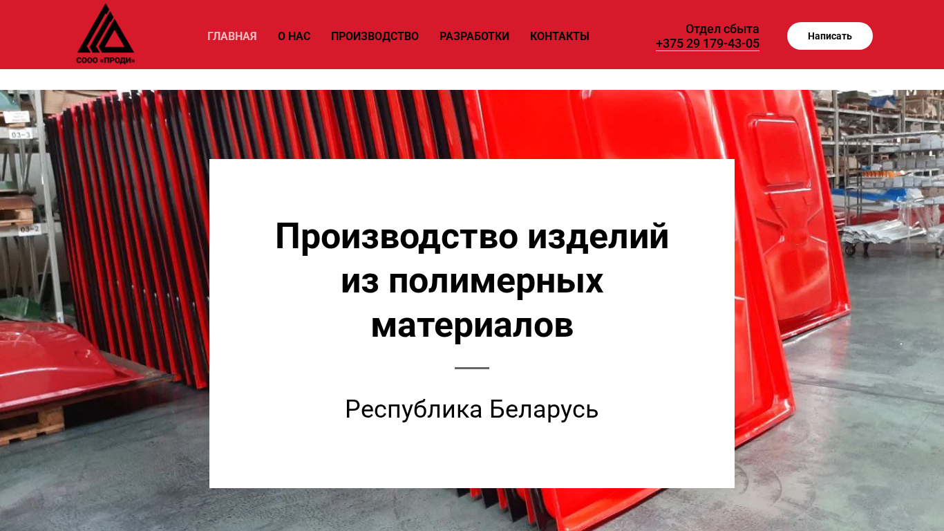 | AI-анализ | This website belongs to a Limited Liability Company named "Проди" located in Dzerzhinsky district, Minsk region, Belarus. The company specializes in the production of plastic products and offers a full cycle of production with modern high-tech equipment. It also manages the resources for production changes and organizes new production processes. The company provides partnership opportunities and has contacts listed for inquiries and orders, including phone numbers +375 29 179-43-05 and common@prodi.by. The company's address is at Fanipolsky s/s, 22 in Dzerzhinsky district, Minsk region, Belarus. The website is open for business from Monday to Friday, 8:30-17:00. The company has produced designs for OAO "Амкодор" and O |