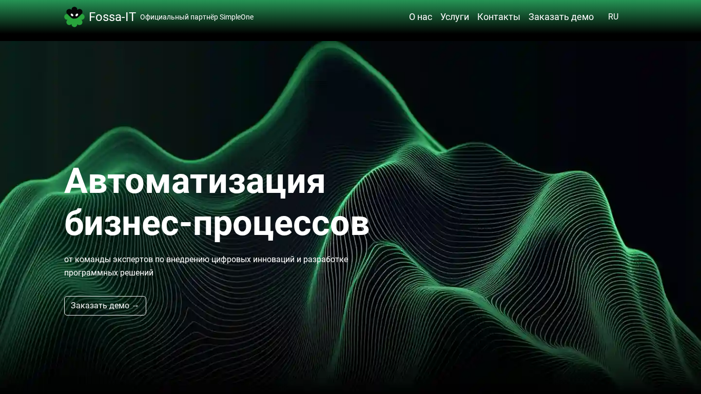 | SEO-описание | Fossa-IT — официальный партнер SimpleOne. Автоматизация бизнес-процессов, разработка ПО и поддержка в Беларуси, России, Казахстане. Закажите демо сегодня! |