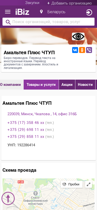 | AI-анализ | The portal Amalteya Plus CTUP is a translation bureau offering text translation into foreign languages, document translation with certification, and apostille and legalization services. It is located at Чкалова 14, office 316B in Minsk, Belarus. The contact numbers are +375 (17) 358 46 xx, +375 (29) 698 11 xx, and +375 (29) 858 11 xx. The company's UNP number is 192286414. The business hours are from 09:00 to 18:00, Monday to Friday, with weekends being a day off. |