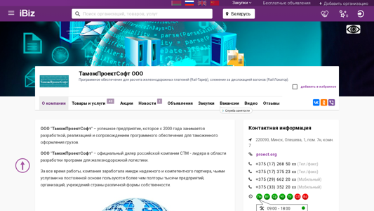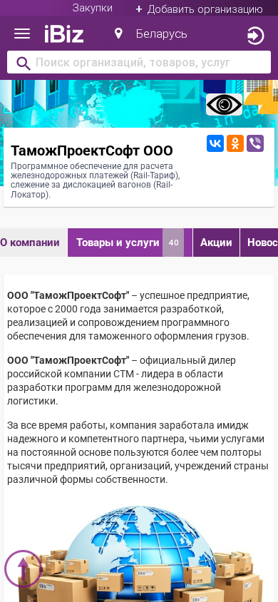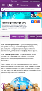 | AI-анализ | --- This online resource belongs to ТаможПроектСофт OOO, a company based in Minsk, Belarus. The website offers software solutions for calculating railway payments (Rail-Тариф) and tracking wagon locations (Rail-Локатор). The organization's address is 220090, Минск, , Олешева, 1, пом. 7н, комн. 7. The website includes sections for company information, products and services related to customs services, rail transportation, and equipment. It also features news, job openings, and customer reviews on social media platforms. The company has been in operation since 2000 and is an official dealer for STM, a leading Russian company in railway logistics software development. Over 1,500 businesses, organizations, and institutions in Belarus rely on |