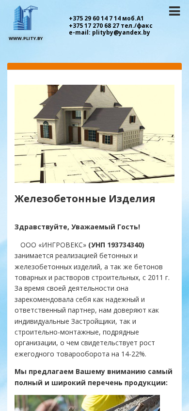| AI-анализ | --- The website <www.plity.by> is dedicated to the sale of various types of concrete and reinforced concrete products, including slabs, foundation blocks, pipes, and fencing elements. The company, OOO "Ingroveks" (UNP 1 93734340), offers a wide range of products, including reinforced concrete blocks, gas-silicate blocks, and foundation blocks from the "ThermoComfort" brand. Additionally, the site lists contact information for the Belagroprombank credit organization and various product specifications such as sizes and materials. The site also includes information on vinotobeam foundations, fbs foundation blocks, and various types of pipes and fittings. The site is available in Belarusian and Russian languages. |