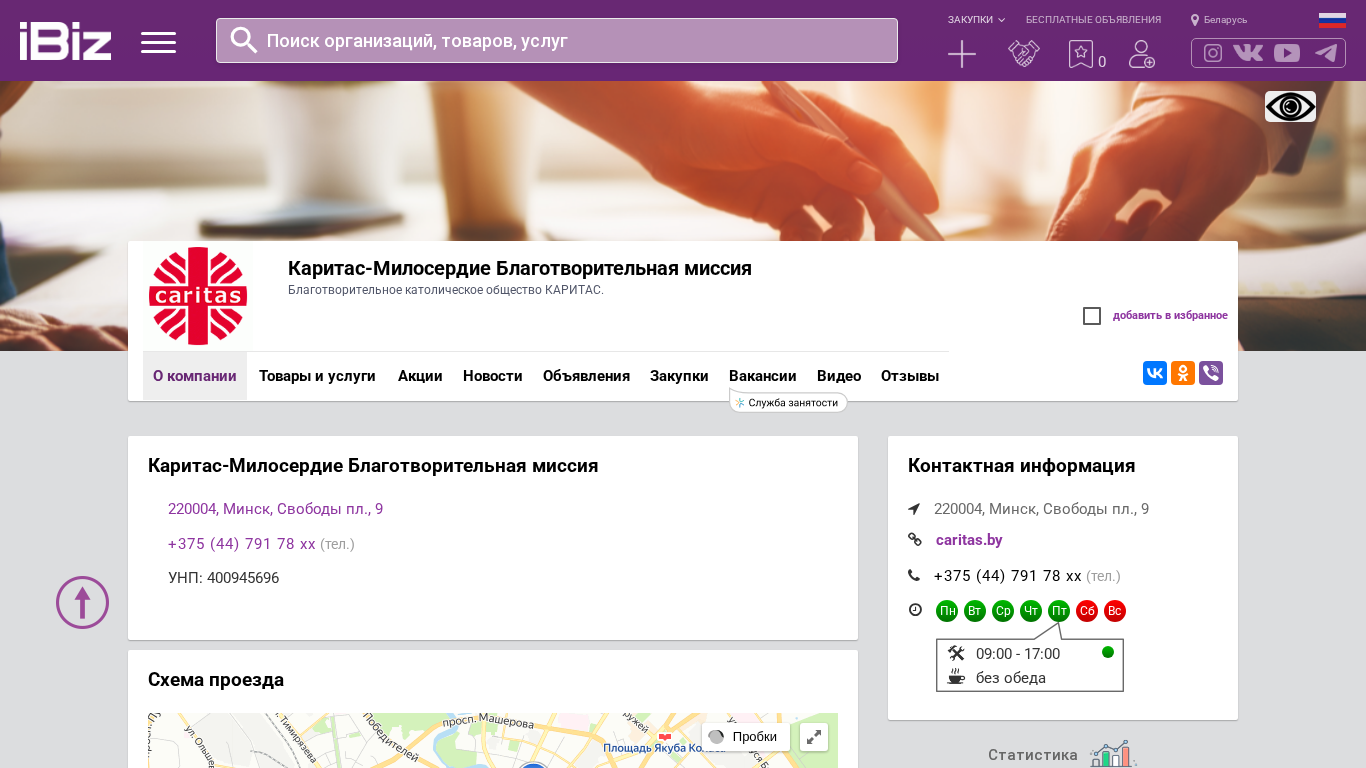 | AI-анализ | The portal Caritas-Miloserdie is a charitable mission and a Catholic society called Caritas. Located in the heart of Minsk at Sviatoho Ducha Square, number 9, it provides various charitable services, including but not limited to, fundraising, donations, and volunteer opportunities. The organization is registered under the Unified State Register of Legal Entities with the number 400945696. Visitors can contact them through the phone number +375 (44) 791 78 xx or visit their website caritas.ibiz.by for more information. The office operates from Monday to Friday, 9:00 AM to 5:00 PM, excluding weekends. |