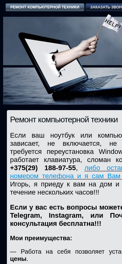 | AI-анализ | The website itehno.by is dedicated to computer repair services. The title of the website is "Ремонт компьютерной техники" (Computer Repair) and it is clear from the description that various types of computer and laptop issues are addressed, including heating, slowing, freezing, not starting, non-functioning programs, and broken screens or keyboards. The website owner, named Igor, promises quick response and on-site repair within a few hours, as well as a free diagnosis. He also mentions having over 10 years of experience in the field and providing official warranties for his work. The website offers phone and home service, as well as the ability to contact Igor via Viber, Telegram, Instagram, or email for free consultation. The website mentions discounts for second devices, pensioners, invalids, veterans, and large families, and a return |