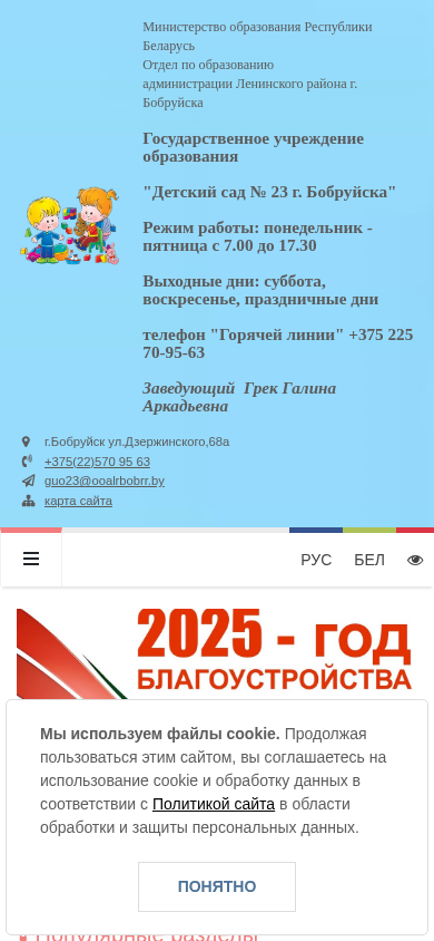 | AI-анализ | This online resource represents the official website for Kindergarten No. 23 in Bobruisk, Belarus, under the jurisdiction of the Ministry of Education of the Republic of Belarus and the Education Department of the Leninsky District Administration of Bobruisk. The site functions as a state educational institution, "State Institution of Education 'Kindergarten No. 23 in Bobruisk'" and operates from Monday to Friday, 7:00 AM to 5:30 PM. The website contains information about the kindergarten's administration, schedule, admissions, policies, and contact details. Visitors can find the administrative working hours and application process, as well as download necessary forms and documents. The site also features a section for 'One Window' where users can access normative legal acts regulating the 'One Window' service. Additionally, there are sections for popular inquiries, |
