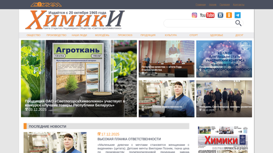 | AI-анализ | The portal Himiki.sohim.by is the official newspaper of Open Joint Stock Company (OAO) 'SvetlogorskHimvolkno'. Established on October 20, 1965, it covers various topics related to the society, production, culture, sports, health, recreation, and people of the organization. The newspaper includes sections for news, archives, contacts, and features articles. It engages in the 'Best Products of the Republic of Belarus' competition and has a presence on social media platforms like Instagram, YouTube, Vkontakte, and Odnoklassniki. The publication features articles on the company's employees, youth, quality assurance, and community initiatives. |