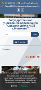 AI-анализ | language: ru This website belongs to the State Educational Institution "Secondary School No. 33 of Mogilev" (<https://school33.by/>). The institution's address is in Mogilev, on Koroleva Street, number 10A. The phone number is +375 (222) 73-58-64, and the email address is school33mogilev@lenobr.by. The website provides information about the school's management, goals and achievements, academic calendar, and various educational and extracurricular activities. Keywords related to the content include 'school', 'Mogilev', 'education', and '2025'. Top words include 'help' and 'safety'. The website also features sections on ideological, civic, and patriotic education, |