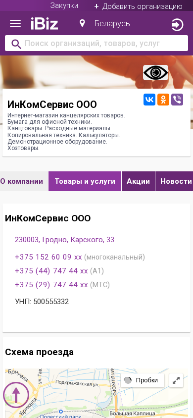 | Название / Заголовок | ИнКомСервис ООО - Интернет-магазин канцелярских товаров. Бумага для офисной техники. Канцтовары. Расходные материалы. Копировальная техника. Калькуляторы. Демонстрационное оборудование. Хозтовары.. 230003, Гродно, , Карского, 33 |