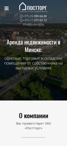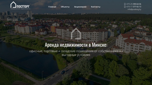 | AI-анализ | language: ru This online resource is for renting commercial real estate in Minsk by ZAO 'Posttorg'. The website offers a wide range of commercial properties for rent, including offices and retail spaces. The company, ZAO 'Posttorg', is the successor to OAO 'Posttorg', which was founded in 1994 and operated in the food retail sector. In 2024, the company changed its business focus to renting out its own real estate assets. Currently, it offers over 6000 m² of property located primarily in the Partizansky district of Minsk on streets such as Kozlova, Pulihova, Uralskaya, Soltysa, Klumova, Geologicheskaya, and Kortava. Renters can expect honest pricing, prompt issue resolution, and favorable offers for the |