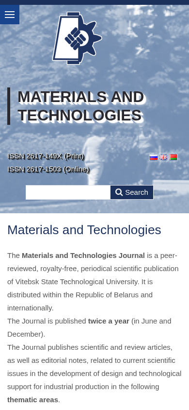 | AI-анализ | The portal is a scientific journal named "Materials and Technologies," published by Vitebsk State Technological University in Belarus. It is issued twice a year, with articles focused on machine building and machine science. The journal covers various aspects of mechanical engineering, drive systems, robotics, and related fields. Articles are peer-reviewed and published online and in print under ISSN 2617-149X and ISSN 2617-1503, respectively. The journal's mission is to disseminate the results of scientific research in these areas and contribute to the identification of scientific potential for industrial implementation. |