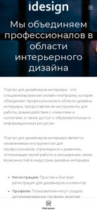 | AI-анализ | The website idesign.by is a specialized online platform that brings together interior design professionals, providing them with tools for work, client and colleague interaction, and access to educational and informational resources. This portal is an essential tool for professionals seeking to develop, optimize their work, and expand their opportunities in the interior design industry. Registration for designers and clients is simple and quick, allowing users to create detailed profiles that include portfolios of work, biographies, client reviews, and contact information. Designers can upload their projects with detailed descriptions, photos, and other materials, while clients can search for designers based on style, location, and experience. The platform offers a catalog of designers, with a system of reviews and ratings to help clients choose reputable professionals. The centralized access to all necessary instruments and resources allows for expanding the client base and networking, as well as raising professional levels and exchanging experiences with colleagues. The |