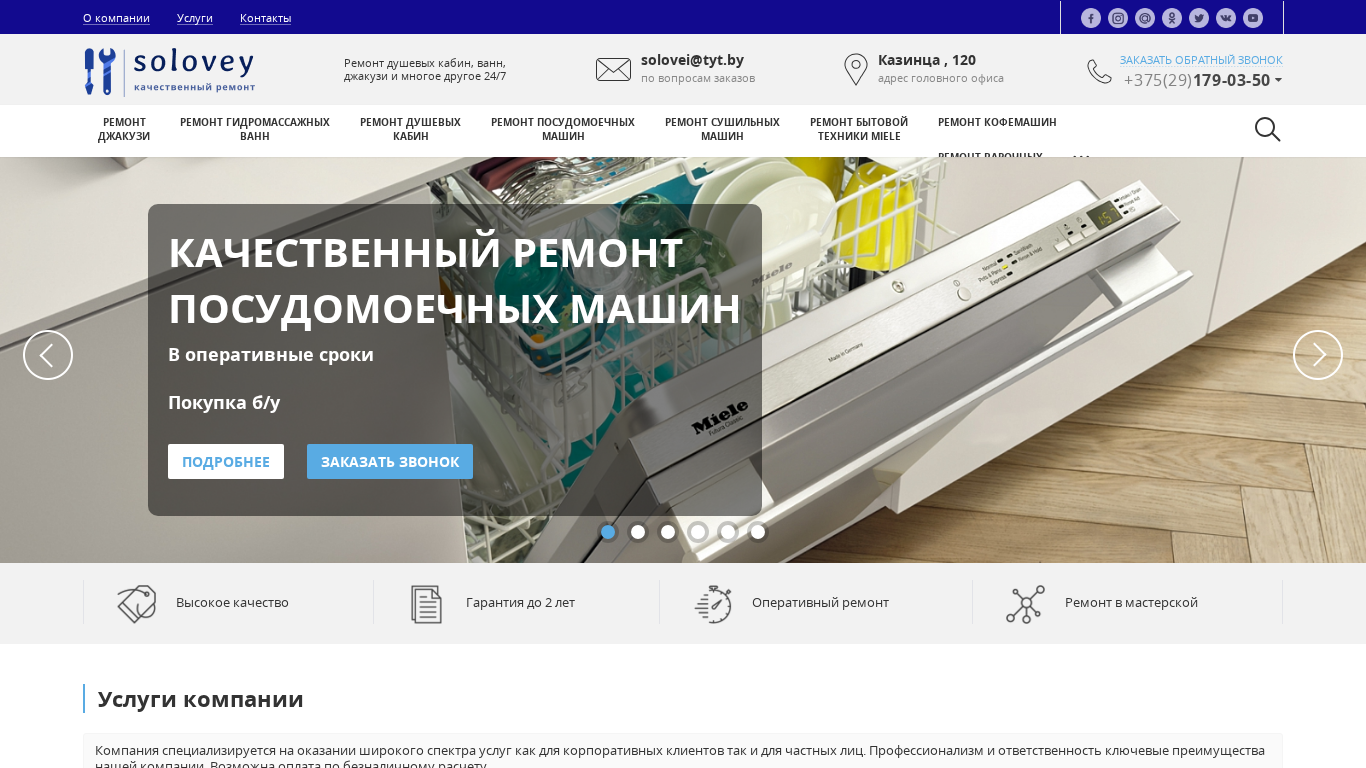 | AI-анализ | --- The website Solovey is a repair services company focusing on various appliances and fixtures, including bathtubs, showers, jacuzzis, washing machines, dishwashers, and industrial pumps. The company offers 24/7 repair services and provides contact information for inquiries and orders. The contact details include an email address, phone numbers for two different telecom providers, and a physical address in Kazinets. The website also lists specific repair services for Miele appliances and mentions the availability of used appliance purchases. The website is developed by an unspecified party and is copyrighted in 2025. The main sections of the site include Services, About the Company, and Contacts. The site's design features a clean layout with a prominent call-to-action button for contacting the company. The language used is predominantly Russian, with some English terms |