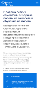 | AI-анализ | This website is a Belarusian platform selling light aircraft and small aviation, with a focus on the Viper SD4 model from TomarkAero. The site offers information on the technical specifications of the Viper SD4, as well as assistance in making a purchase. Interactive presentations of the aircraft's cockpit and interior, color options, and observation flights are also available. The company, SтройпланАэро, is the exclusive representative of TomarkAero in Belarus and aims to promote the growth of small aviation in the country by making it an accessible and enjoyable pastime for enthusiasts. The Viper SD4 is a modern sport aircraft suitable for recreational and observation flights, as well as pilot training. The site includes sections on the aircraft's information, technical specifications, and assistance in selecting the Viper SD4 kit. Contact information, including a postal |