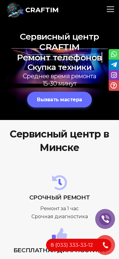 | AI-анализ | The web project "CRAFTIM" is a service center in Minsk, Belarus, offering repair services for phones, laptops, and computers with a guarantee. Repairs are carried out both on-site and at their service center, catering to various brands such as Samsung, Apple, Xiaomi, Huawei, and others. The website provides contacts for inquiries, including a phone number (333-33-12) and email address (info@craftim.by). The services offered include repair of phones, laptops, system blocks, tablets, and Apple Watches, as well as the sale of technology and mining services. The average repair time ranges from 15 to 30 minutes, and customers can opt for a quick repair or a free diagnosis. The website also mentions original parts and various payment methods, including card payments, bank transfers, and |