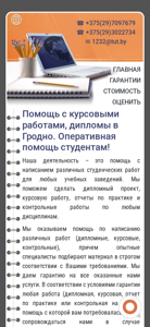 | AI-анализ | The portal provides help with various student works such as essays, theses, diplomas, and projects in Grodno. All works are done under contract and officially. Discounts are given for multiple services. Contact information: +375(29)7097679, +375(29)3022734, 1232@tut.by. Address: Grodno, Railway Street, 7, office 2. Services include help with thesis papers, control tasks, curriculum projects, diploma projects, and answers and study guides. Masters' thesis referees and solutions to tests are also offered. Clients have positive reviews, praising the quick turnaround, accurate responses to academic requirements, and timely assistance before thesis defenses. The business offers operational assistance to students and guarantees all services with potential revisions if necessary. |