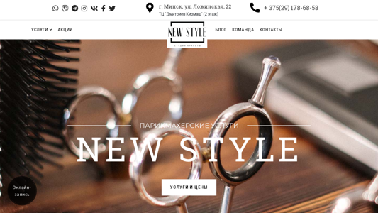 | AI-анализ | The website is a beauty salon called "New Style" located in Minsk, Belarus, on Lozhinskaya Street, 22, in the Dmitryev Kirmash shopping center (second floor). The salon offers various beauty services including parikmaher (hairdressing), manicure, pedicure, depilation, and makeup. The website features a blog, a team presentation, and contact information, including WhatsApp, Viber, Telegram, Instagram, Vk, Facebook, and Twitter. The salon offers a variety of services such as haircutting for women, men, and children, hair styling and coloring, manicures, pedicures, and eyebrow and eyelash services. Prices for the services range from 16 rubles for a children's haircut to 195 rubles for complex hair |