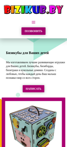| AI-анализ | The portal Bizikub.by is a children's toy portal offering high-quality, handcrafted, developmental toys for children. The website includes a catalog, gallery, reviews, delivery and payment information, and contact details. The toys offered include bizykubs, bizibords, bizitraks, and dollhouses. These toys are designed to mimic common household items, providing children with familiar objects to explore. Bizikub toys are made with natural materials and use only safe, water-based acrylic paints for children from birth. Customers can either choose from available toys or place a custom order with specific color, completion, and preference options. The website also features a section for previous projects. |
