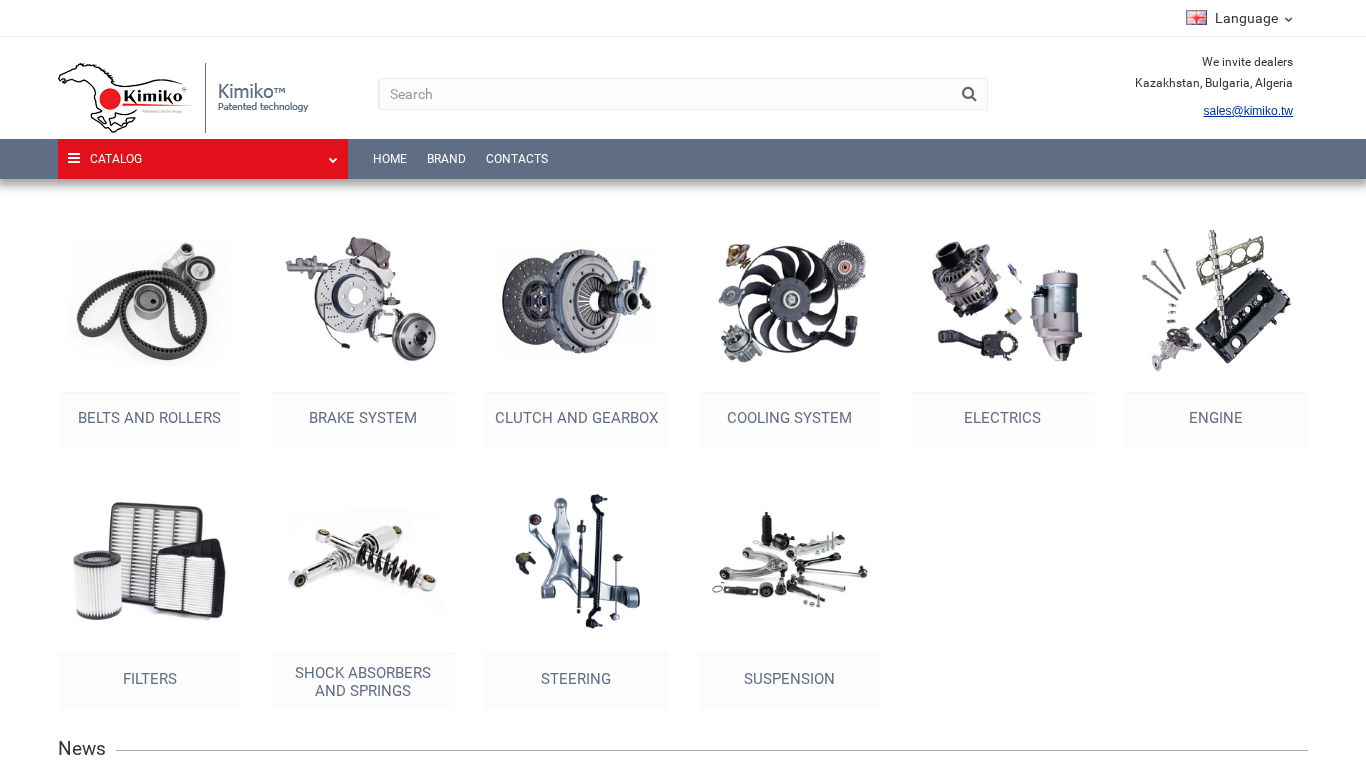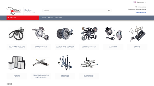 | AI-анализ | This website is for Kimiko™, an Asian auto parts manufacturer. The title and description of the website indicate this. Keywords related to auto parts include belts, rollers, brake, clutch, gearbox, cooling, electrics, engine, filters, shock absorbers, springs, steering, and suspension. The website offers these products for sale and includes a shopping cart feature. The website is available in English, Russian, and Ukrainian. The contact information includes an invitation for dealers in Kazakhstan, Bulgaria, and Algeria to contact sales@kimiko.tw. The website also features a catalog, news section, and information about certificates for dealers. |
