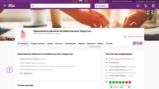 | AI-анализ | The website is a consumer cooperative, named Березовское районное потребительское общество - РАЙПО, located in Bереза, Belarus, with the address Любарского, 32. The website offers trading and public catering services. Contact information includes three phone numbers for the reception, the first deputy chairman of the board, and the chief accountant. The company's Unified State Register number is 200021812. The website also provides a map for directions and business hours from Monday to Saturday, 9:00 AM to 6:00 PM, without lunch breaks on weekdays. The website is registered under the domain brzraipo.ibiz.by. |