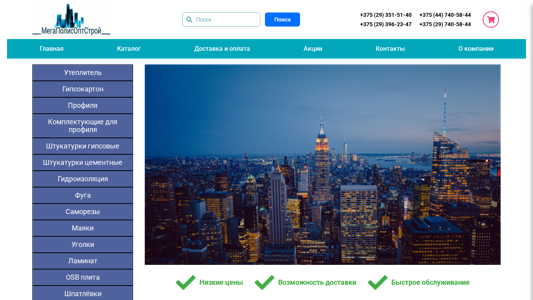 | AI-анализ | This website is an e-commerce platform selling construction materials. The title is 'Главная' (Home), and the description is blank. The keywords include various building materials such as gypsum, cement, insulation, self-levelers, plaster, laminates, OSB panels, and various types of clays. Top words are numbers related to Belarusian phone numbers and the words 'главная' (home), 'каталог' (catalog), 'доставка' (delivery), and 'о компании' (about the company). The website offers delivery and payment options, as well as contacts for the company. The domain is mega24.by. |