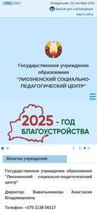 | AI-анализ | This website is the official website of the Liozensky Social-Pedagogical Center, a state educational institution located in Liozno, Belarus. The website provides information about the center's structure, working hours, administrative procedures, contacts, and various services. It includes sections for specialized professionals, a daycare center, and sectors focusing on preventing social issues, such as family instability and social orphanhood. The website also features interactive features, such as an electronic inquiry system and a rating assessment portal. Users can find information on licensing, occupational safety, and important documents related to the center. Additionally, the website offers consultative services and a summer recreational program. The contact information for the center, including the director's name and phone number, is provided. |