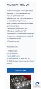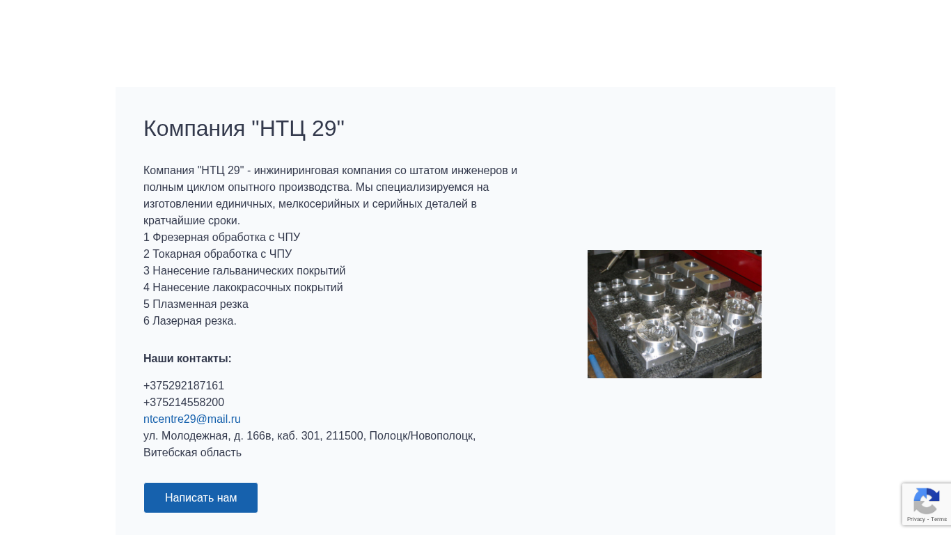 | AI-анализ | This website belongs to Company "НТЦ 29," a Belarusian engineering company with a team of engineers and a full production cycle. Specializing in the manufacture of one-off, small-batch, and series components in the shortest possible time, the company offers various machining processes, including CNC milling, turning with CNC, galvanic coating, lacquer coating, plasma cutting, and laser cutting. The website includes a contact form for inquiries and a brief company description, but no phone numbers or email addresses are provided. The site design is simple and functional, with a focus on presenting the company's services and capabilities. |