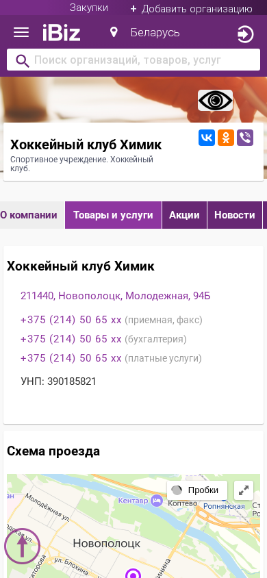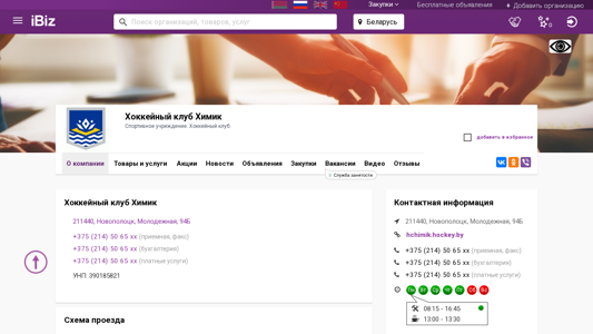 | AI-анализ | The web project "Hockey Club HIMIK - Sports Institution" is a hockey club located in Novopolotsk, Belarus, with the address Molodezhna 94B. The website provides contact information, including phone numbers for the reception, accounting, and paid services. The company's Unified State Register number is 390185821. The website also includes a map for directions and information about business hours. |