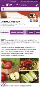 | AI-анализ | The portal arnika-agro.ibiz.by is a business organization based in Могилев, Belarus, with a focus on the cultivation and sale of apples, berries, and Chinese cabbage. Established in 2001, the company has been growing high-quality and fresh produce for over twenty years. Their product range includes apples, berries, and Chinese cabbage. The business operates from twenty-two buildings, some of which house modern and equipped storage facilities and cold storage rooms. Arnika-Agro employs proven techniques, combining traditional methods with the latest technology. The company's contact information includes phone numbers +375 (222) 60 36 xx and +375 (29) 646 76 xx, and their business hours are from 9:00 to 18: |