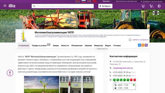 | AI-анализ | language: ru The web project "Могилевоблагрохимизация УКПП" offers services for agrochemical and radiological investigation of soil on agricultural lands. Performing soil analysis for the content of macro- and micronutrients. Determining the content of radionuclides in soil and agricultural products. 213108, , Daшkovka ag., Pарковая, 22. The organization "Могилевоблагрохимизация УКПП", established in 1981, is focused on addressing complex challenges related to preserving and increasing soil fertility, improving the efficiency of agricultural chemicals usage. The company has modern equipment and tools, with departments including planning, analysis of fertilizer usage and project documentation development, agricultural soil investigation, and a planning and accounting department. The main |