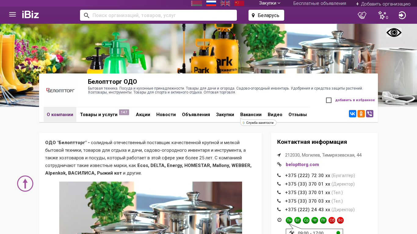 | Название / Заголовок | Белоптторг ОДО - Бытовая техника. Посуда и кухонные принадлежности. Товары для дачи и огорода. Садово-огородный инвентарь. Удобрения и средства защиты растений. Хозтовары, инструменты. Товары для спорта и активного отдыха. Оптовая торговля.. 212030, Могилев, , Тимирязевская, 44 |