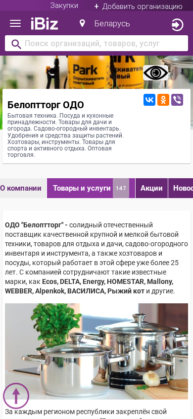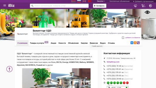 | AI-анализ | This online resource, titled "Белоптторг ОДО," is a trading company specializing in the sale of household appliances, tableware, and kitchenware. They also offer products for cottages and gardens, including gardening tools and equipment, fertilizers, and plant protection products. Additionally, they sell household items, tools, and goods for sports and active leisure. The company is based in Mogilev, Belarus, with the address 212030, Timiryazevskaya, 44. The website provides information on the company, its products and services, as well as free classified ads for purchases. Keywords associated with the website include "optoвая торговля" (optotorga, or wholesale trade), "товары" (goods), "техника" (technology), "инвентарь |