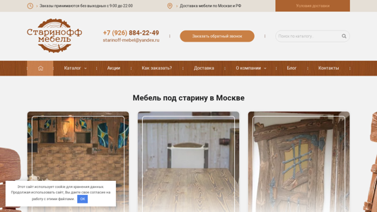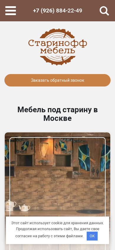 | AI-анализ | The website is an e-commerce platform selling antique-style furniture under the brand 'Старинофф-Мебель'. The title and description indicate that the website offers furniture made of high-quality wood in the antique style, with the keyword 'под старину' translating to 'in the antique style'. The website accepts orders without weekends from 9:00 to 22:00 and delivers furniture across Moscow and Russia. The catalog includes various types of furniture such as tables, chairs, cabinets, and decorative items like mirrors and lamps, with categories like 'Декоративные балки', 'Кухни под старину', and 'Люстры и светильники под старину'. The website also mentions custom orders and production, eco-friendly materials, and collaboration opportunities. The color pal |