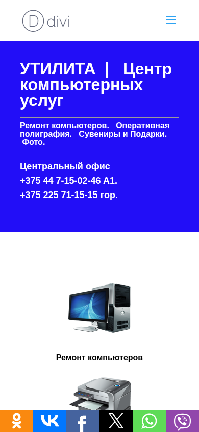 | SEO-описание | УТИЛИТА это Центр компьютерных услуг. Ремонт компьютеров, Оперативная полиграфия, Сувениры и Подарки, Фото в Бобруйске тел. +375 44 7-15-02-46 |