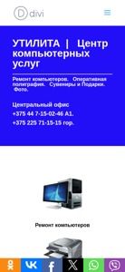 | AI-анализ | The web project "Utilita.by" is the website for a Computer Services Center named "Utilita" located in Bobruisk, Belarus. The main pages of the site include "Home," "Contacts," "About Us," and "Site Map." The homepage features a description of the center's services, which include computer repair, operational printing, souvenirs and gifts, and photo services. The central office can be reached at +375 44 7-15-02-46, with an additional phone number for a branch office in the city at +375 225 71-15-15. The site also includes a shopping cart that operates from 9:00 AM to 6:00 PM, seven days a week, located to the left of the store "Tri Semyorki." Services offered include computer repair |