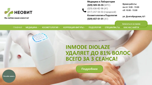 | AI-анализ | This online resource is a medical center named "Неовит" (Neovit). The website offers various medical services, including cosmetology, podology, diagnosis, dermatology, gynecology, and laboratory diagnosis. The main sections are "Медицина" (Medicine), "Гинекология" (Gynecology), "Дерматология" (Dermatology), "УЗИ-диагностика" (UZI-diagnosis), "Косметология" (Cosmetology), and "Подология" (Podology). Services range from laser epilation and cosmetic procedures to gynecological diagnosis and treatment, and dermatological diagnosis and treatment for skin conditions. The website also features a section for laboratory diagnosis, including tests for gynecological, urolog |