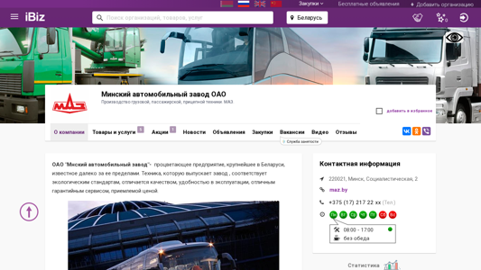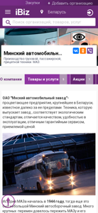 | AI-анализ | This website is for the Belarusian state-owned Minskiy Avtomobilny Zavod OAO (Minsk Automobile Plant), which specializes in the production of commercial vehicles, buses, and trailers. The company is located in Minsk, Belarus, at the address Социалистическая, 2. The website provides information on the organization's products and services, which include the sale of new and used vehicles, spare parts, and special equipment based on Minsk Automobile Plant vehicles. The website also features job listings, news, and company information. The company has a long history, dating back to 1944, when it was still a small auto assembly plant. Today, it is a major industrial player in Belarus and beyond, known for its eco-friendly, high-quality, user-friendly, and affordably-priced vehicles |