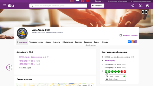 | AI-анализ | This website is for the Belarusian company "Autamigo OOO," located at Dzerzhynskogo pr-t, 3G in Minsk, with phone numbers +375 (29) 370 60 xx and +375 (33) 375 90 xx. The company specializes in importing vehicles from the United States and offers them for purchase. The website includes a map for finding the company's location, as well as its business hours, which are from 10:00 to 20:00, Monday through Friday, with weekends being a day off. The company's Unified State Register number is 490655291. The website also features a section for adding the organization to users' favorites and includes various categories for automobile sales and representative offices of automobile |
