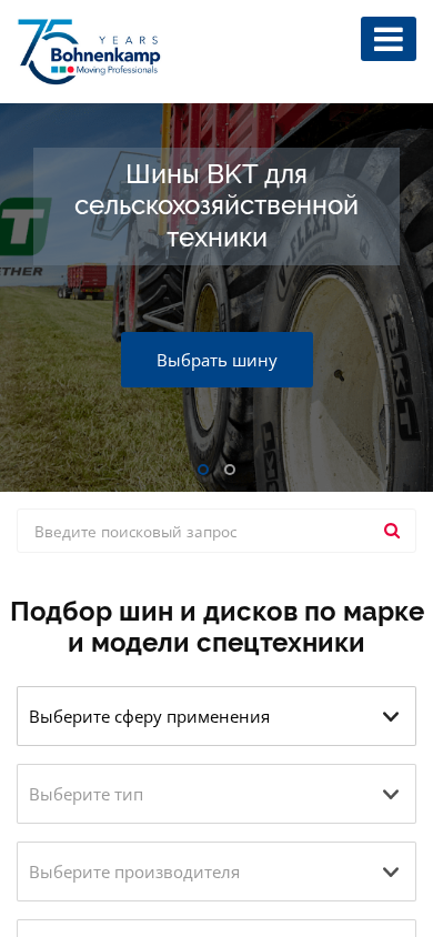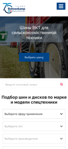 | AI-анализ | The portal Bohnenkamp is a reliable supplier of specialty tires, steel disks, cameras, complete wheels, axles and other components for industrial, agricultural, mining and other specialized equipment, as well as cargo trucks and trailers. The company also offers a wide range of axles and other components for agricultural equipment. The website includes sections for product catalogs, company information, customer reviews, vacancies, certificates and contact details. The company's offerings are categorized under various product types such as agricultural/garden tires, tractors and combine tires, forestry tires, construction tires, tires for lifting equipment, and tires for motorcycles, ATVs, carting and karting cameras. The website also features a tire usage calculator, a tire pressure calculator, and a tire finder tool. The company's mission is to provide high-quality and reliable products to meet the diverse needs of its |