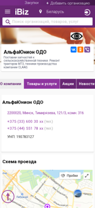 | AI-анализ | The website is a business directory listing for AlphaUnion ODO, a company based in Minsk, Belarus, specializing in the sale of parts for agricultural machinery and the repair of MT3 tractors and Claas equipment. The contact details and address, including phone numbers and a map, are provided, along with business hours. The company is listed under the categories 'Parts for agricultural machinery' and 'Auto repair for road, special and agricultural machinery'. The website also includes sections for news, vacancies, and customer reviews. |