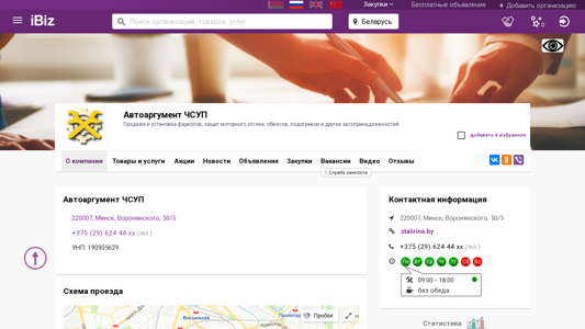 | AI-анализ | This online resource is dedicated to the sales and installation of various automotive accessories such as fender flares, motor compartment protectors, side skirts, and heating systems. The company, named Автоаргумент ЧСУП, is located in Минск, Belarus, specifically at Воронянского 50/5. The contact information for the company includes a phone number, +375 (29) 624 44 xx, and an UNP number, 190905629. The business hours are Monday to Friday, 9:00 AM to 6:00 PM, with no breaks for lunch. The website also provides a map for customers to find the location and details on how to get there. The company offers a range of services and products related to automotive servicing and repair. |
