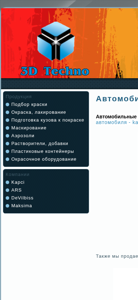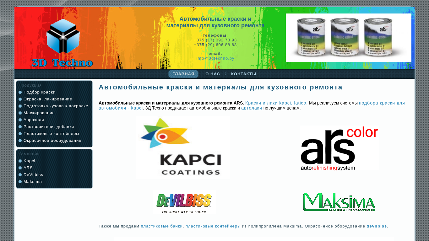 AI-анализ | The web project is dedicated to offering automobile paints and materials for body repairs. Keywords include 'automotive paints', 'color selection for car', 'repair materials', 'kapci', 'latico', 'ars paint', 'car paints', 'car lacquers', 'automotive lacquers', 'marbling putty', 'scotch painter's putty', 'plastic containers', 'plastic boxes', 'solvent', 'devilbiss', and 'ars'. The website provides information on various automotive paints and repair materials, offering a color selection system for cars (kapci), as well as selling plastic containers and painting equipment. Companies featured include Kapci, Ars, DeVilbiss, and Maksima. Contact details for the company, 3D Techno, are provided, along with the sale of automotive paints and repair |