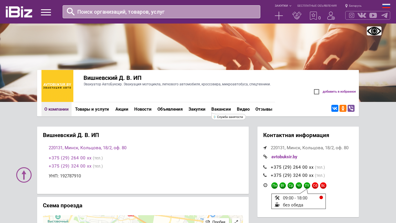| Название / Заголовок | Вишневский Д. В. ИП - Эвакуатор АвтоБуксир. Эвакуация мотоцикла, легкового автомобиля, кроссовера, микроавтобуса, спецтехники.. 220131, Минск, , Кольцова, 18/2, оф. 80 |