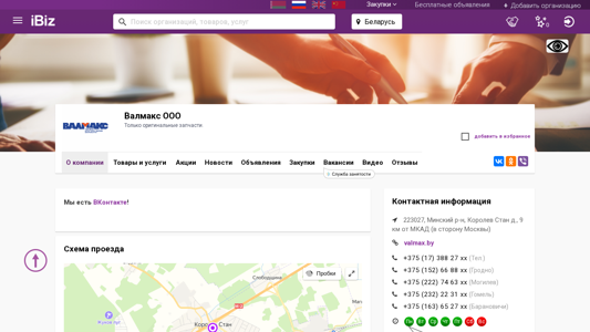 | AI-анализ | The portal Valmaks.ibiz.by is an e-commerce website specializing in the sale of original auto parts for various types of vehicles, with a focus on heavy-duty trucks and agricultural machinery. The company, Valmaxs OOO, is located in Belarus, 9 km from the MKAD towards Moscow, at the address 223027, , Королев Стан д. The website provides contact information with multiple phone numbers for different locations, including in Minsk, Grodno, Mohilev, and Baranovich. Business hours are listed as Monday through Friday, 8:30 AM to 5:00 PM, with weekends as holidays. The site offers various services and products, including the sale of engines, cabins, transmission parts, and undercar components, as well as importing and custom-made parts under request. Key |