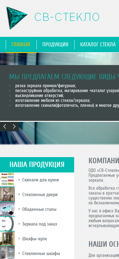 | SEO-описание | ОДО «СВ-Стекло» - обработка стекла и зеркал в Могилеве. Изготовление мебели из стекла под заказ. Каталог продукции на сайте. Звоните! |