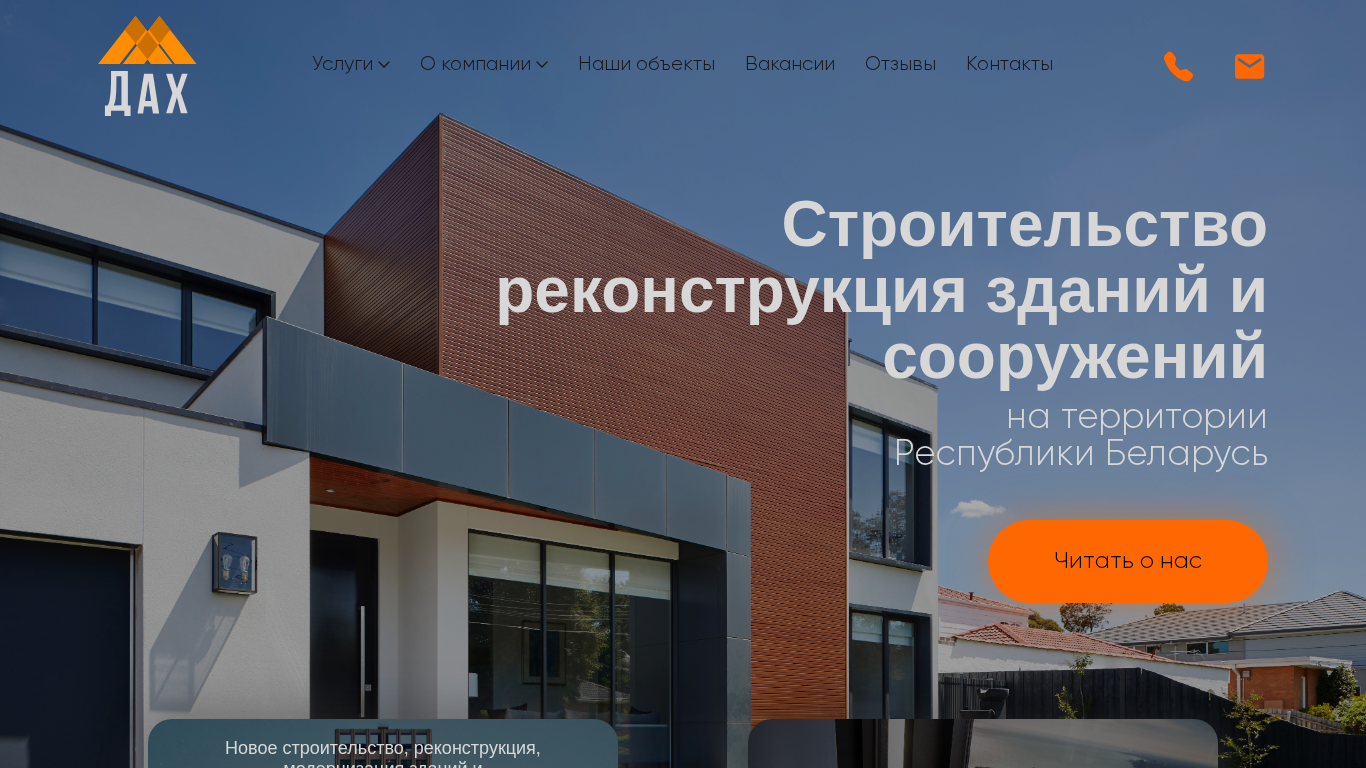 | AI-анализ | The web project "ОДО «ДАХ»" offers services related to the construction, rehabilitation, modernization, and capital and routine repairs of buildings and structures in the territory of the Republic of Belarus. The company has been operating since 1994 and has completed over 1000 projects. The website provides information on the company's activities, including production of PVC and aluminum profile windows and doors. The project also features a section for vacancies, contact information, and customer reviews. Additionally, there is a new offering for the sale of townhouses. The website is developed by Anna Sakurova. |