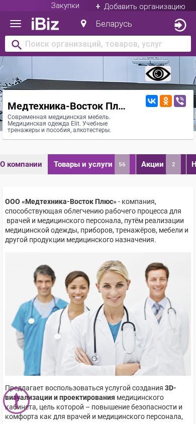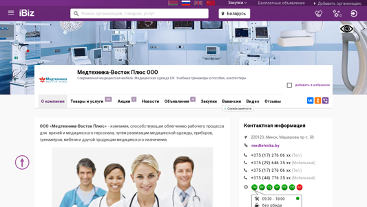 | Название / Заголовок | Медтехника-Восток Плюс ООО - Современная медицинская мебель. Медицинская одежда Elit. Учебные тренажеры и пособия, алкотестеры.. 220123, Минск, , Машерова пр-т, 50 |