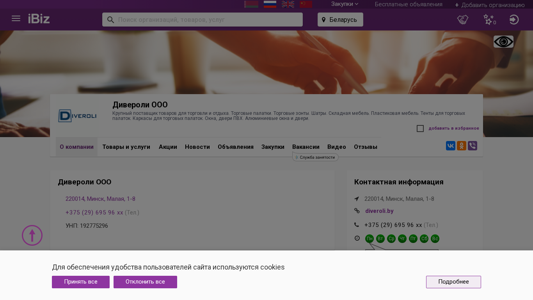| Название / Заголовок | Дивероли ООО - Крупный поставщик товаров для торговли и отдыха. Торговые палатки. Торговые зонты. Шатры. Складная мебель. Пластиковая мебель. Тенты для торговых палаток. Каркасы для торговых палаток. Окна, двери ПВХ. Алюминиевые окна и двери.. 220014, Минск, , Малая, 1-8 |