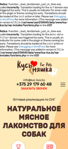 | AI-анализ | This online resource is a catalog for dog treats called "Кусьняшка" (Kus-kus). The website contains information about their products, contracts for production, and contacts for orders and inquiries. Users can leave a request for a call. The site includes a section for the catalog, contract production, and opto sale in the CIS. The products are described as natural meat treats for dogs, providing complete nutrition for healthy growth, and all products are certified. The catalog includes details about the nutritional benefits of the treats, such as protein for growth, vitamins for immune system support, minerals for strong teeth and bones, healthy fats for energy, and fiber for quality digestion. The website also emphasizes the love and care put into the production of the treats. The website has some technical issues with translation loading, likely due to early plugin or theme execution. |